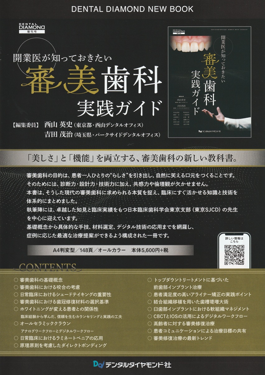 西山英史院長による審美歯科の最新専門書がついに出版されました。本書では、歯のホワイトニング、ラミネートベニア、セラミック修復など、臨床現場で役立つ最新の審美歯科治療の知識と技術を詳しく解説しています。歯科医師や歯科衛生士、審美治療に関心のある方に必読の一冊です。専門家の視点から審美歯科の実践ノウハウを学びたい方におすすめです。